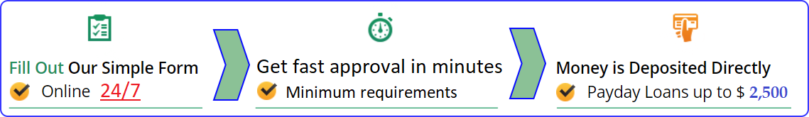 Fill out an application right now and funds will be deposited very quickly after approval! Typically, the loan approval takes up to 5-10 minutes.